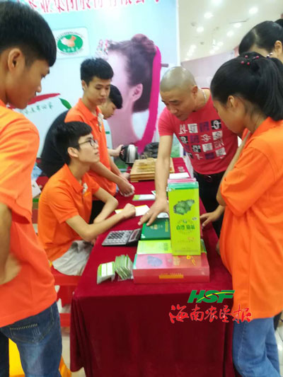 图为学子在爱心助学街海垦茶业爱心店销售茶叶。
